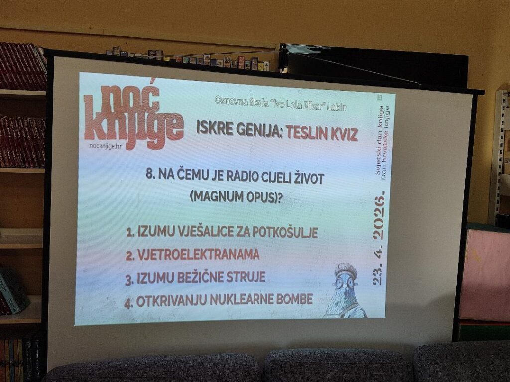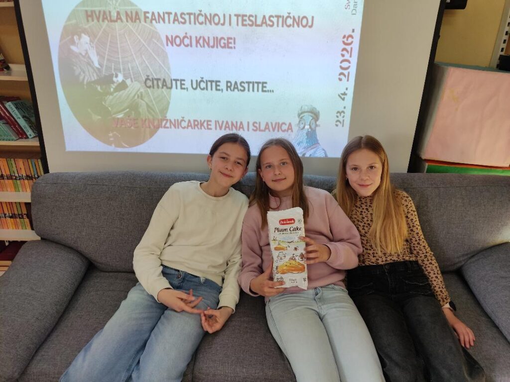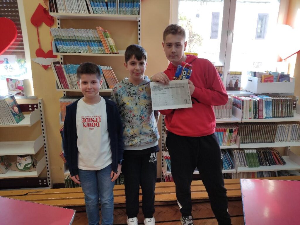 Dana 23. travnja obilježava se Svjetski dan knjige i autorskih prava, a od 2012. godine u Hrvatskoj i Noć knjige. Naša se knjižnica pridružila manifestaciji te svake godine u popodnevnim satima organizira druženje sa zainteresiranim učenicima petih razreda s ciljem poticanja knjige i čitanja. Ovogodišnja tema je O životinjama i ljudima pa smo na druženje pozvali i labinsku autoricu Josipu Milevoj koja je napisala serijal slikovnica o psu Flekiju, ali su likovi i mačak Figaro, slonica Lanka pa je ovo bila odlična prilika da vidimo zašto su nam životinje toliko važne i zašto je upravo njih odabrala za likove. Igrali smo i prigodne igrice vezane uz knjige koje u naslovu imaju životinje, a izabrali smo i pobjednike našeg 3. fotonatječaja Noći knjige. Čestitke Zari Alessiji Dizdar za osvojeno 1. mjesto, Janu Fornažaru na 2. mjestu, Abdullahu Adnanu na 3. mjestu te Mateju Brescu na nagradi za najsimpatičniju fotografiju. Našoj gošći hvala na dolasku i pomoći, kao i našim učenicima koji su se odazvali pozivu na popodnevno druženje u knjižnici.