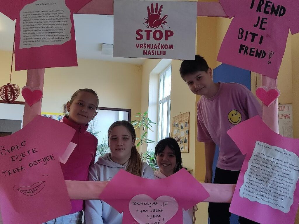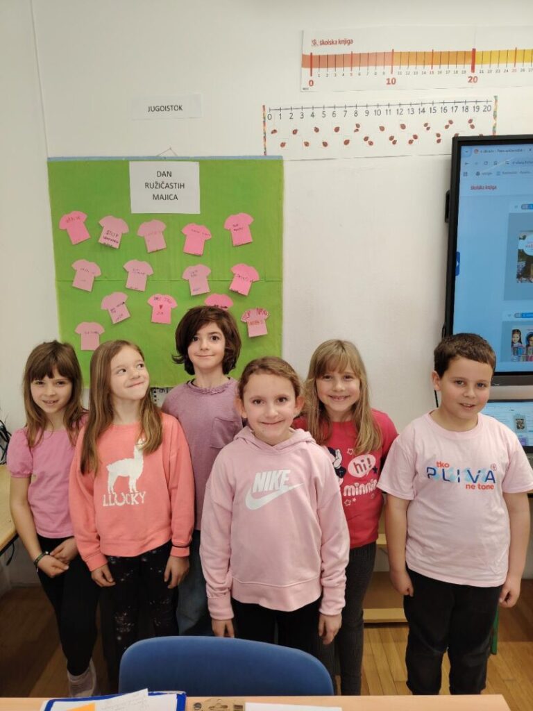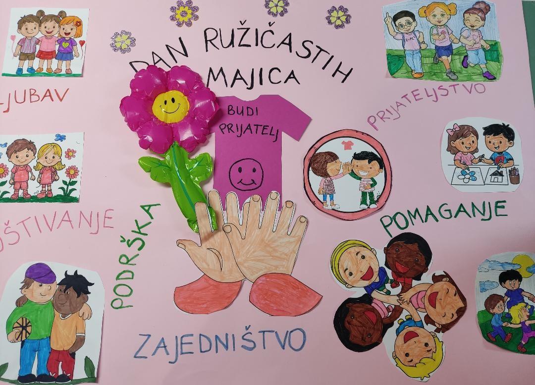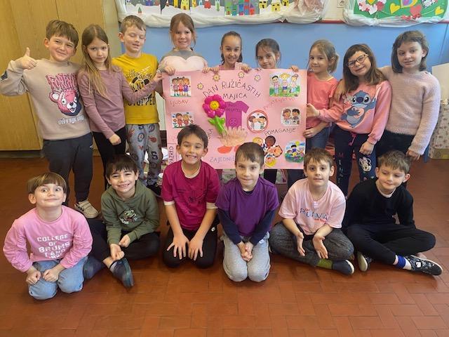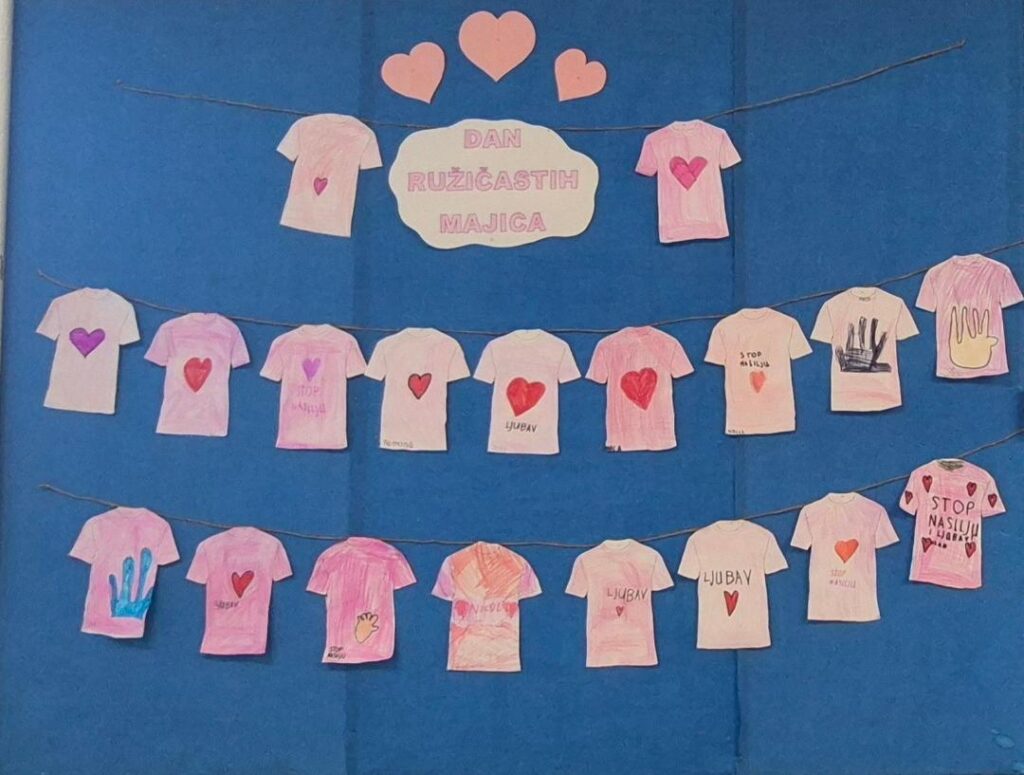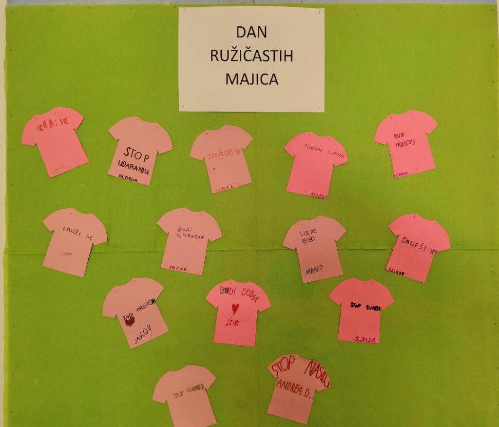 Posljednje srijede u veljači obilježava se Dan ružičastih majica kojim se prevenira vršnjačko nasilje i promovira tolerancija. Obilježavanju toga dana pridružila se i naša škola, učenici mlađih i starijih razreda, a mnogi su bili prepoznatljivi upravo po ružičastoj majici koju su toga dana nosili. Ružičaste su majice krasile i školske hodnike, učenici su sa svojim učiteljicama izradili prigodne plakate i okvire u kojima su se kroz dan i fotografirali, a na nastavi su se provodile radionice i gledali edukativni filmovi kojima se učenike poučavalo toleranciji, prihvaćanju različitosti i nenasilnom rješavanju sukoba. Naglasak je bio na malim koracima koje svatko od nas može učiniti da bude što manje žrtva nasilja, na koji način nasilje možemo spriječiti i kome se možemo za pomoć obratiti. Hvala svima koji su svojim aktivnostima doprinijeli obilježavanju ovog dana.